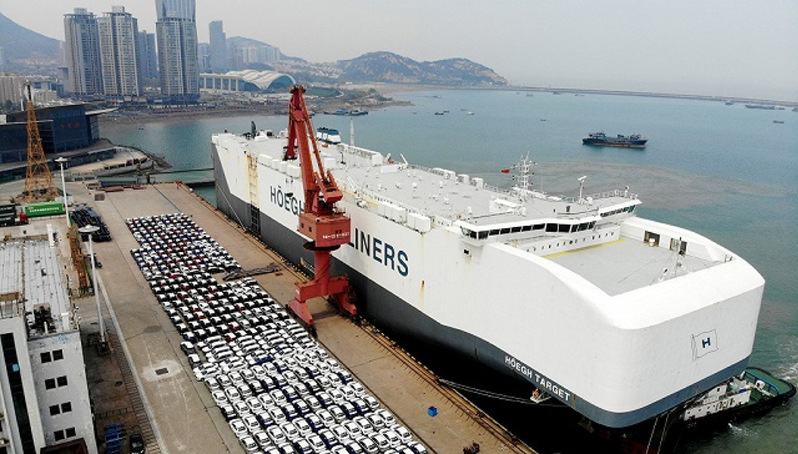 2020年4月18日,在连云港港东方公司码头,一艘大型远洋滚装轮靠泊69泊位准备装载400台车辆出口沙特阿拉伯。