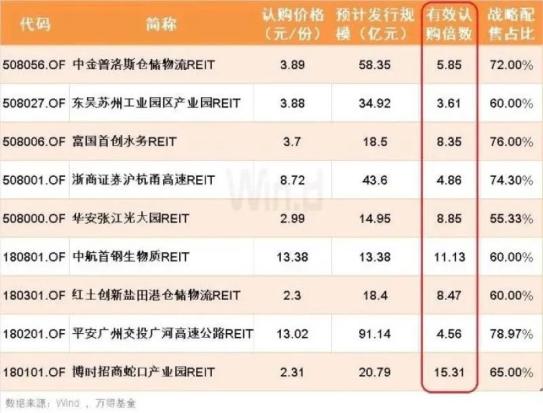 6月21日,上海首批9只公募不动产投资信托基金(REITs)产品正式上市交易。Wind数据显示,这9只公募REITs平均战略配售比例为66.8%,平均有效认购倍数近8倍,预计共募集资金314.02亿元。基本投向基础设施补短板项目,包括高速公路项目、工业园区项目及仓储物流项目、绿色项目。