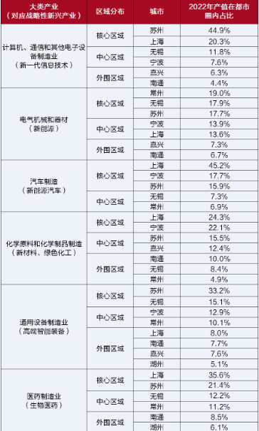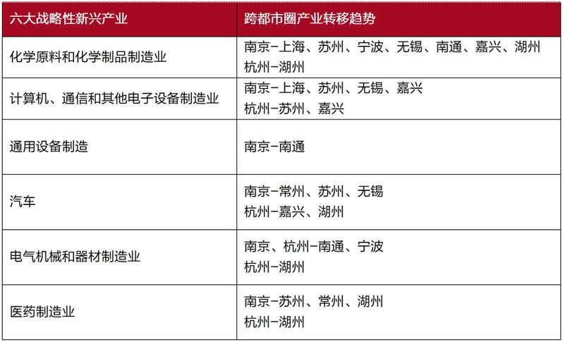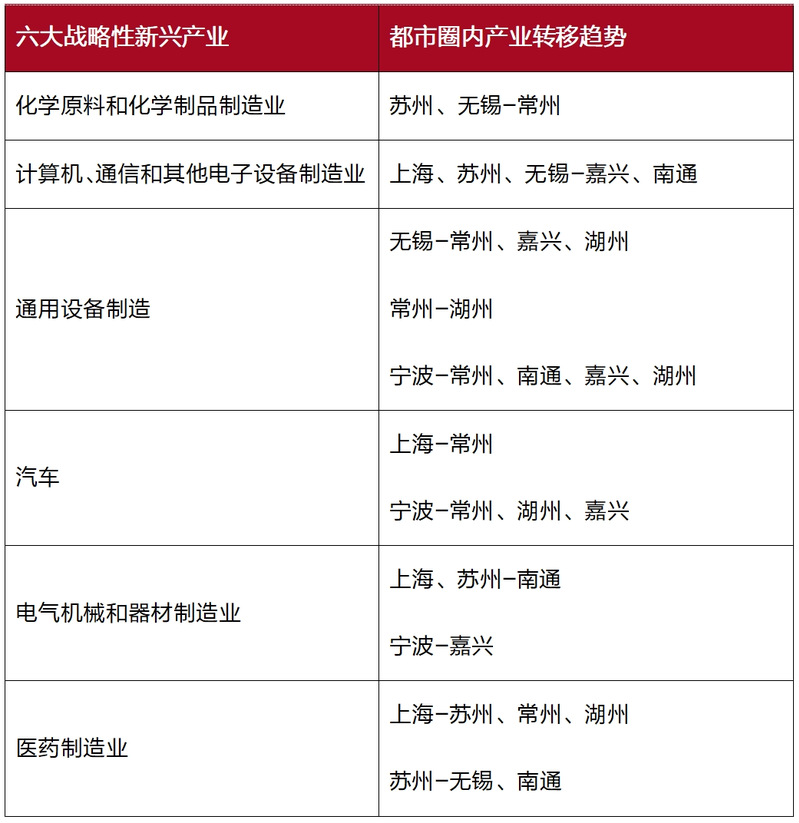 目前都市圈内各城市在六大制造业的产业结构有所趋同。上海近五年延续制造业外溢趋势,六大制造业的产值在都市圈内的占比均有所下降,苏州、无锡、宁波充分比较优势、着力发展优势产业,例如苏州医药制造业在都市圈内的份额提升7.5个百分点,但化工、电子信息的份额均有所下降。进一步结合区域分工指数来看,上海与苏锡甬三市的产业分工合作水平有所降低,仅在化工、汽车的分工水平有所上升,可见头部城市的战略性新兴产业结构较为相似。与此同时,近五年经济体量相对较小的常州、嘉兴、湖州发展提速,六大制造业在都市圈内的产值份额显著提升。这些外围区域城市积极承接中心城市战新产业转移,例如常州、湖州嘉兴积极承接上海、宁波等地汽车产业转移,南通在电气机械、医药方面承接上海、苏州等地产业转移。