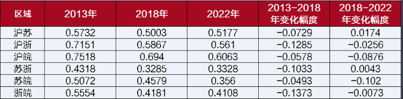 表4:2013-2022年长三角技术密集型产业营收在全国份额的变化情况