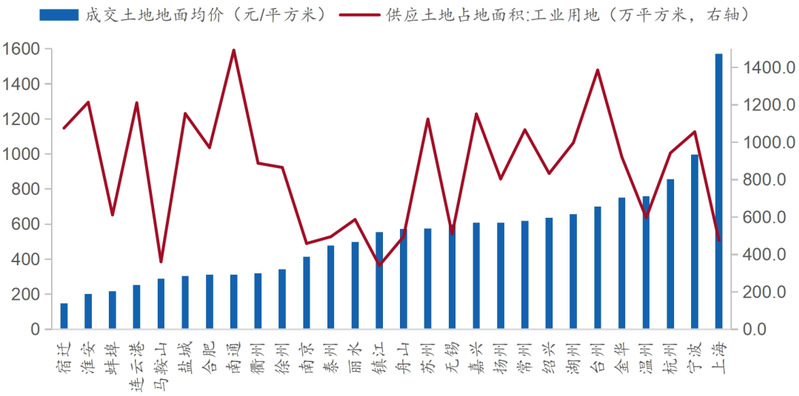 图2:2022长三角部分地市工业用地成交价及供应情况