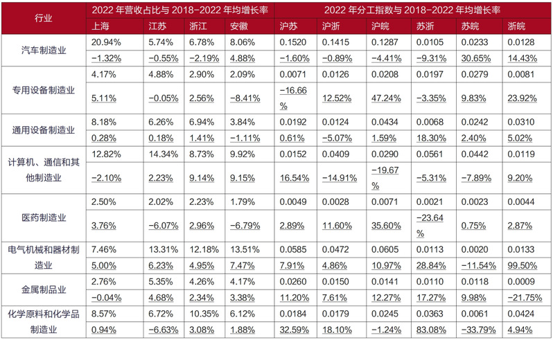 我们进一步聚焦长三角八大优势行业,来判断上海与江浙皖三地在2018-2022年的细分行业分工情况。江苏与上海产业间分工趋势显著。沪苏分工指数近五年呈小幅增长,其中电子信息、电气机械和器材、金属制品、化工贡献较大,可见上海和江苏在这些行业走差异化发展路线。例如在电子信息制造业中,上海和江苏营收占比均较高,但上海营收呈现收缩趋势,江苏呈现扩张趋势,两地形成差异化分工。浙皖承接产业转移的同时,部分产业也呈现差异化分工。沪浙2018-2022年分工指数小幅降低,两地在通用设备、电子信息营收占比差距缩小,产业结构呈现趋同调整,但与此同时专用设备、金属制品、化工行业的营收占比差距变大,逐步形成差异化分工。安徽与上海的分工指数大幅降低,其中汽车和电子信息产业贡献最大,两地营收占比差距缩小,产业结构趋同调整,但在专用设备和医药产业,沪皖两地呈现差异化分工。