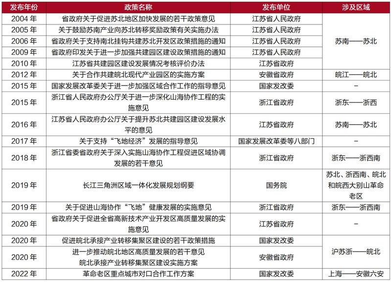 长三角跨区产业合作政策起步早,三省一市从省内合作走向省际协同,政策示范效应显著。早在2003年,位于苏南地区的江阴就与苏北的靖江两市联合建设 “江阴-靖江工业园”,成为我国最早开启跨区域产业园建设试点的区域。此后政策示范效应不断扩散,三省一市均出台了一系列支持苏北、浙西南、皖北等省内薄弱地区的产业转移和园区合作政策,跨区合作也逐步从省内走向省际,层级不断提高。