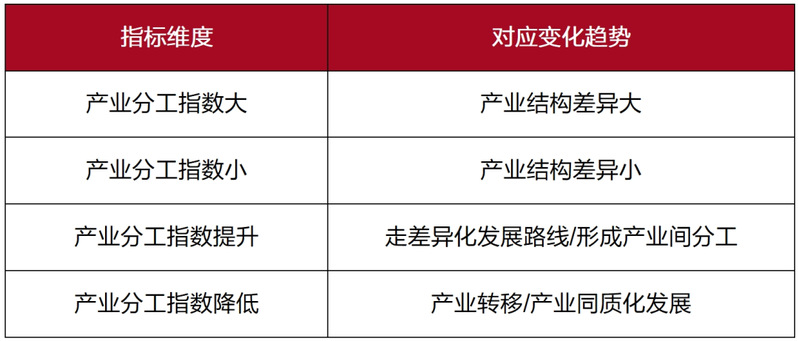 我们进一步以区域分工指数【注释3】来衡量各省的产业分工合作程度。指数值越高,两地区产业结构差异程度越大;指数值越低,两地区产业同构性越高。通常而言,产业分工指数的提升表明两地走差异化发展路线,产业间分工水平上升;产业分工指数的降低可能表明两地存在产业转移与承接,但也可能是产业同质化发展的表现。