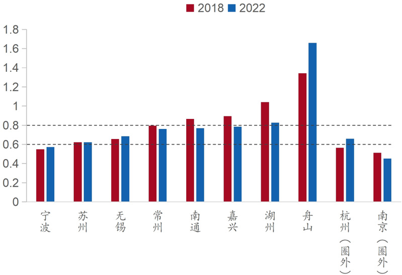 从上海大都市圈内产业分工与转移情况来看,都市圈内产业间分工逐步减少,产业转移由内向外呈现圈层式扩散。一是头部城市的产业结构已较为相似。观察2018、2022两个年份各城市之间的区域分工指数,可以发现,头部城市上海、苏州、无锡、宁波之间的区域分工指数在2018年已处于较低水平(均小于0.7),且在过去五年变化幅度较小,大类产业结构已较为相似。二是外围城市与头部城市产业结构差异相对较大,但承接转移力度加大。2018-2022年,常州、南通、嘉兴、湖州等城市与头部四市的产业分工指数有大幅下降,仅舟山市由于产业结构单一而导致产业分工水平上升。随着都市圈同城化发展,龙头及区域中心城市的产业溢出效应已经逐渐由核心区域向外围区域扩散,外围城市开始大力承接产业转移。