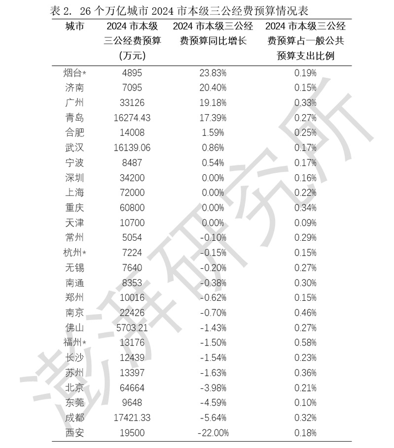 再来看万亿城市数据。26个2023年GDP达到万亿的城市中(表2),除去泉州未公布数据,剩下25个城市中有7个(28%)2024年市本级口径“三公”经费总额上涨,它们分别是烟台、济南、广州、青岛、合肥、武汉和宁波。