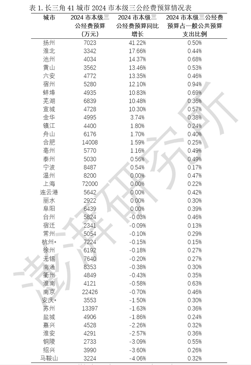 截至5月23日,长三角41个城市中(表1),除去湖州和滁州未公布数据,剩下39个城市中有16个城市(41%),2024年市本级“三公”经费预算相比2023年有所上涨。