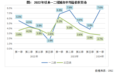 而若细究一二线土拍热度的结构数据,同样不容乐观。2024年一季度,一二线城市有11%的地块溢价率超过15%,“超高热度”的地块占比确实创下2022年以来的新高;但是若连带溢价率超过10%的地块一并统计,2024年一季度只有17%的地块超过这一门槛,仅与2023年三季度相若,远远低于2023年上半年27%的水平。因此当前溢价率上涨、频频出现地王的缘由,更多的还是应当解释为土拍溢价率取消之后,对于那些少数优质地块盈利空间的“补偿式”涨价。