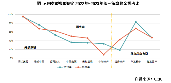 对比企业2023年在长三角的投资金额占全年总投资的情况,不同类型的房企对长三角的青睐程度仍有明细差异: