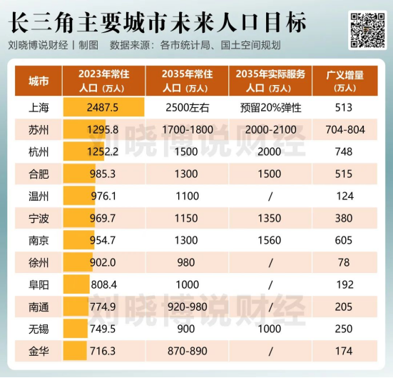 长三角内部来看,近几年,南京、苏州人口增长放缓,而杭州、合肥则展现潜力。2023年,南京常住人口增加5.6万人 、苏州增加4.7万人,杭州、合肥分别增加14.6万人和21.9万人。2022年,南京和苏州的人口增量为6.8万、6.3万,杭州、合肥的这值为17.2万、16.9万。南京的发展,其实是落后于国家给它的规划的。2016年国家给南京的规划很高,但是南京现在的人口规模排到长三角第七。最近几年南京的人口总量和增速,都被合肥超过了。人气不旺,成为制约南京经济发展的重要因素之一。未来,如何增加人口,将成为困扰南京发展的一个关键问题。当然,增加人口的前提条件是增加企业,提供更多的就业机会,南京目前的经济看起来,似乎还提供不了和2035年常住人口目标1300万相适应的就业机会。在杭州最新的国土空间规划中,中心城区的范围得到大幅扩容,面积达880平方千米,重点建设国际化旅游休闲中心、制造业转型升级主平台、会展之都等。随着国家对科技创新愈发重视,以杭州“六小龙”——游戏科学、深度求索、宇树科技、云深处科技、强脑科技、群核科技为代表的一批科技企业出圈,叠加杭州主城区扩容,辐射能级放大,未来杭州的人才吸引力还将加强。若保持2023年人口增长14.6万人的速度,预计2035年,杭州的常住人口将达到1427.4万人,与常住人口1500万目标差距不大。合肥在2023年录得人口21.9万的增量,位居全国城市之首,若按此增量算,2035年,合肥的常住人口将达到1248.1万人,接近1300万常住人口目标。合肥人口增长好,和房价低、抓住科创产业有很大的关系。放眼整个长三角,合肥的科技定位排第二。凭借 “综合性国家科学中心” 这一关键定位,合肥在城市科技领域的站位,超过杭州、南京、苏州。合肥的经济实力可能不如苏杭,但是,较高的科技定位,成为经营企业、吸引人才的重要利器。综合看,杭州目前的人口增量和城市产业、发展规划比较匹配,未来有望成为真实的长三角人口第二城。而合肥人口要先突破千万,晋升为长三角特大城市,再谈下一步人口竞争。03截至2023年底,长三角地区的常住人口已达2.38亿人,约占全国人口的比重为16.9%,全国每6个人中就有1个生活在长三角。作为我国经济发展最活跃、开放程度最高、创新能力最强的区域之一,长三角人口大战,正进入白热化阶段。目前常住人口排名长三角城市第二的苏州,未来的人口雄心最大;而2025年开年就风头无两的杭州,凭借不断跃升的城市、产业能级,有望成为2035年长三角真正的人口第二城。