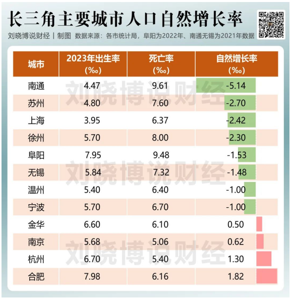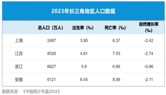 统计长三角主要城市人口出生率、死亡率数据可见,江苏南通、苏州、徐州、无锡,人口自然增长率均为负值。