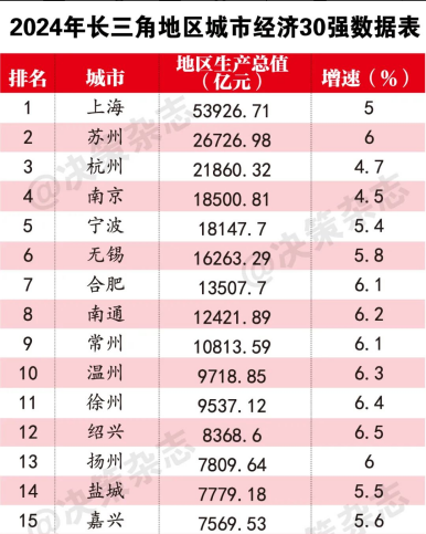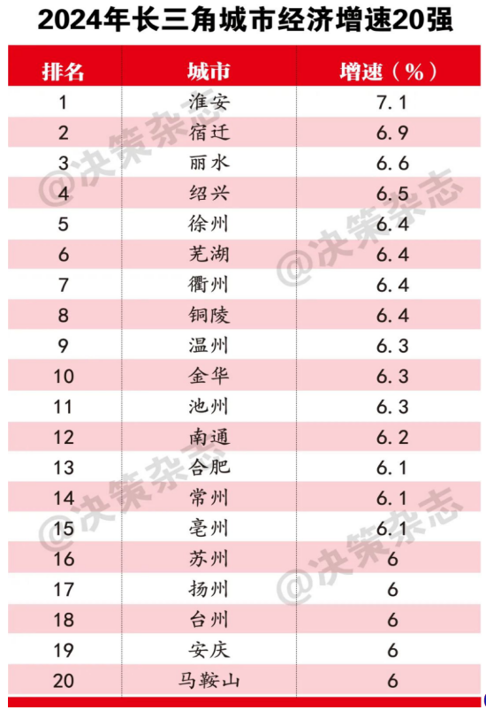 说完了总量格局变化,再来看长三角城市经济的增速。策叔梳理发现,有20个地市的增速跑到6%及以上。其中,淮安7.1%、宿迁6.9%、丽水6.6%,增速位列前三甲。而且,这三市全年一直保持高速增长的态势。为什么这么快?地方经济能够快速发展,工业是核心驱动力。先看淮安,全年规模以上工业增加值增长9.4%,规上固定资产投资增长13.3%。其中,工业投资增长25.3%,快于规上投资增速12个百分点。新建投产企业对全市规模以上工业增长贡献率达17.7%,工业生产加速增长,有效投资不断扩大。再看宿迁,全年规模以上工业增加值增长8.4%,工业经济32个行业大类中,26个行业产值实现增长,增长面达81.3%。特别是有色金属冶炼和压延加工业、化学纤维制造业、计算机通信和其他电子设备制造业,分别增长31.4%、30.3%、22.9%,有力推动了工业经济的稳健运行。最后看丽水,规模以上工业增加值471.8亿元,增长9.3%。装备制造业、战略性新兴产业、高新技术产业增加值分别增长15.9%、14.6%、8.8%,占规模以上工业增加值比重分别为41.3%、21.5%、60.7%,新兴产业表现亮眼。对比2023年区域经济成绩单,策叔发现,有一位选手实现了增速的强势“逆袭”,就是苏州。从2023年的增速4.6%到2024年的6%,苏州是怎样做到的?首先苏州拥有雄厚的制造业实力。苏州拥有全部工业门类中的35个大类,规模以上工业总产值持续保持在4万亿元以上,制造业增加值突破万亿元,是国内工业体量最大、配套最全、垂直整合能力最强的城市之一。2024年、2025年,苏州连续二年以“新年第一会”的形式,推进新型工业化,彰显这座制造业名城坚持工业立市、兴市、强市的魄力。2024年,苏州制造业交了不俗的成绩单,全市规模以上工业总产值迈上4.7万亿新台阶,实现高新技术产业产值25726.3亿元。新增高端科技仪器等3个国家先进制造业集群,光纤光缆入选国家中小企业特色产业集群;获批建设全国唯一人工智能赋能新型工业化先导区、先后获评国家新型技改城市等试点,产业向新步伐稳健。其次是消费成为经济增长主引擎。消费活,经济活,苏州正在构建“世界工厂”与“消费枢纽”的双重身份。2024年,苏州成为首个消费破万亿的普通地级市,在苏州之前,已有上海、重庆、北京、广州、成都和深圳6个万亿消费城市。最强地级市能够跻身“万亿消费城”,关键在于激发城市的消费潜能和发挥好制造大市的供给优势。第三是苏州外向型经济不断复苏。2024年,苏州外贸强劲复苏,实现进出口总额26193.1亿元,增长6.8%。民营企业、外资企业双向发力,分别实现进出口额10346.4亿元、14818.9亿元,增长6.9%、7.7%。