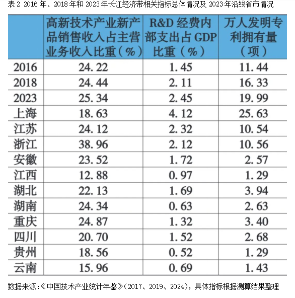 长江经济带是当前我国新一轮改革开放转型、实施区域开放开发的主要战略平台,自2016年以来,从要素驱动向创新驱动转变趋势明显,依靠科技、管理及模式创新,不断创造新业态、新模式和新产业,出现了科创走廊、科技联盟、产业联盟等协同创新的模式。2016年、2018年和2023年长江经济带高新技术产业新产品销售收入占主营收入比重呈现逐步增长态势,表明新产品的产业发展贡献度不断提升。2016—2023年R&D经费内部支出占GDP比重增长了1个百分点,科研投入的力度持续加强。万人发明专利拥有量不断增加,2023年比2016年增加了8.55项,创新驱动发展的能力明显增强。长江经济带各省、市科技创新的差距较大,2023年上海R&D经费内部支出占GDP比重达到4.12%,高于最低省份贵州3.43个百分点,承担起源头创新引领作用,是国内外重要的创新中心(表2)。上中游地带创新投入不断增加,湖北、重庆、四川在创新应用、科技成果转化等方面明显提升,成为区域性创新中心。