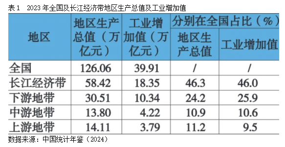 长江经济带产业规模不断增长,经济总量保持稳定增长,实现了流域经济总量的扩大,是中国经济健康发展的重要“脊梁”。2023年,长江经济带实现地区生产总值达58.42万亿元,占据了全国46.3%的经济总量,其中工业增加值达18.35万亿元,占全国的46.0%。从带内发展规模来看,2023年,长江下、中、上游地带实现地区生产总值占全国比重分别达24.2%、10.9%、11.2%,中、上游地带经济总量之和比下游少2.6万亿元,呈现出两极分化现象。同年,长江下游地带完成工业增加值10.34万亿元,占全国比重为24.2%,中、上游地带占全国比重分别为10.9%、11.2%,下游地区工业增加值远超中、上游地带之和(表1)。总体来看,下游地区生产总值、工业增加值占带内总量的比重都超过一半,是流域内经济发展的引擎。